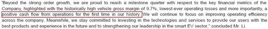 本季度,蔚来汽车综合毛利率为8.4%,而去年同期和上个季度综合毛利率则分别为-33.4%和-12.2%;公司整车销售毛利率达到历史最高的9.7%,而去年同期和上个季度分别为-24.1%和-7.4%。