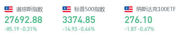 周三道指跌85.19点,或0.31%,报27692.88点;纳指跌64.38点,或0.57%,报11146.46点;标普500指数跌14.93点,或0.44%,报3374.85点。