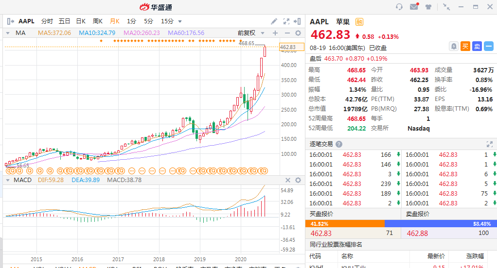周三苹果一度涨超1%,盘中市值突破两万亿美元,美股首个市值突破两万亿美元的股票诞生。截止收盘,苹果股价报462.83美元,市值达19788亿美元,再创历史新高。