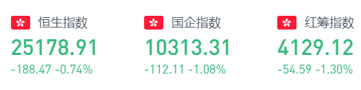 因8号东南烈风或暴风信号生效,昨日港交所取消早市交易。证券市场及衍生产品市场于下午1时30分恢复交易,开盘后恒指急挫近300点,并维持横盘震荡至收盘。周三收盘,恒生指数跌188.47点或0.74%,报25178.91点,全日成交额达845.81亿。国企指数跌1.08%,报10313.31点,红筹指数跌1.3%,报4129.12点。