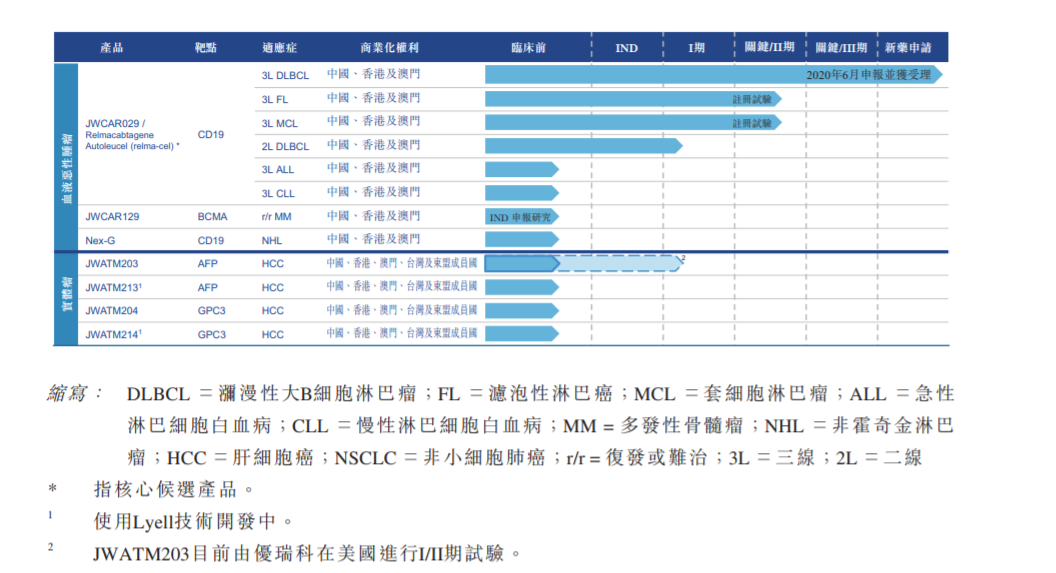 此外,JWCAR129为靶向BCMA的CAR-T疗法。Nex-G为靶向CD19的新一代CAR-T疗法,采用了新的技术和平台,生产周期更短,质量标准更高。JWATM203为靶向AFP的TCR-T疗法,JWATM204为靶向GPC3的T细胞疗法。