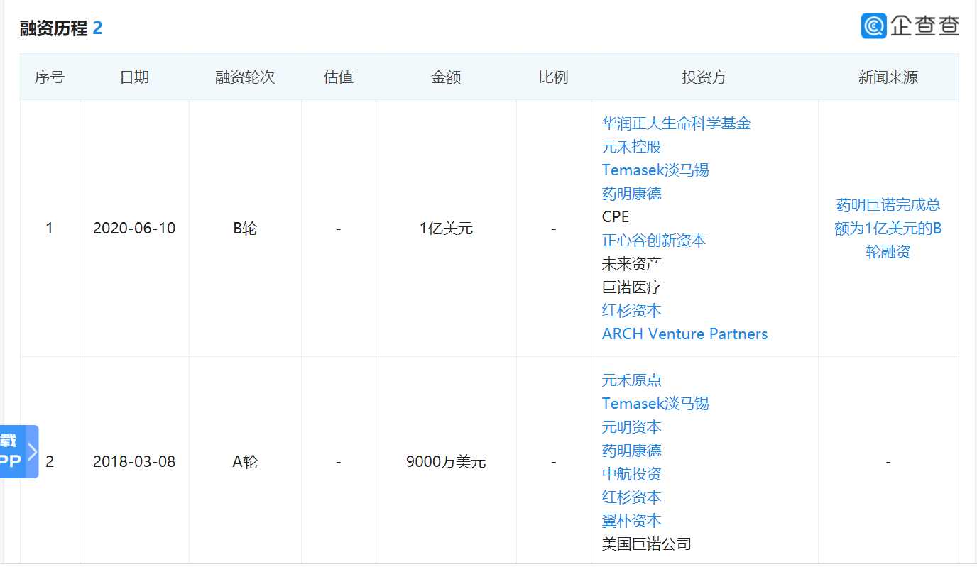 据资本邦了解,药明巨诺是一家专注于细胞免疫疗法的生物制药公司,成立于2016年4月,由药明康德和美国巨诺公司共同成立。药明巨诺是国内首个获得以CD19为靶点的CAR-T细胞治疗产品IND临床批件的企业。2018年,公司完成了9000万美元A轮融资,投资方包括药明康德、红杉中国、美国巨诺公司等。同年,药明巨诺宣布,将在苏州生物纳米科技园建立首家商用CAR-T细胞制造工厂。今年6月9日,药明巨诺完成了1亿美元的B轮融资,获得药明康德、红杉资本、巨诺医疗、淡马锡等老股东的再次加持。据悉,此次募集资金拟用于持续推动JWCAR029的临床研究、进一步扩充研发管线和商业化准备以支持新产品上市。