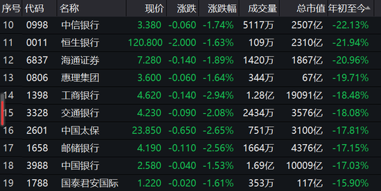 今年恒指跌幅不足13%,值得注意的是,建设银行H股自7月高点大跌了14%,今年以来,中信银行暴跌22%,恒生银行跌22%,工商银行跌18%,交通银行跌18%,邮储银行、中国银行跌超17%。