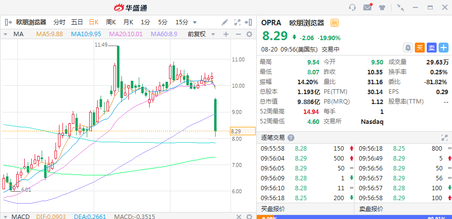 华盛资讯8月20日消息,美股盘初,欧朋浏览器股价大跌,截止至21:56,跌19.9%,报价8.29美元。