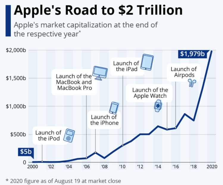 在过去20年间,苹果公司从陷入困境的50亿美元市值公司发展到如今市值2万亿的科技巨头,实现了无与伦比的崛起。尽管存在新冠疫情带来的挑战,但苹果公司股价今年仍上涨了50%以上,事实证明该公司的业务并未受到此次全球危机太大负面影响。