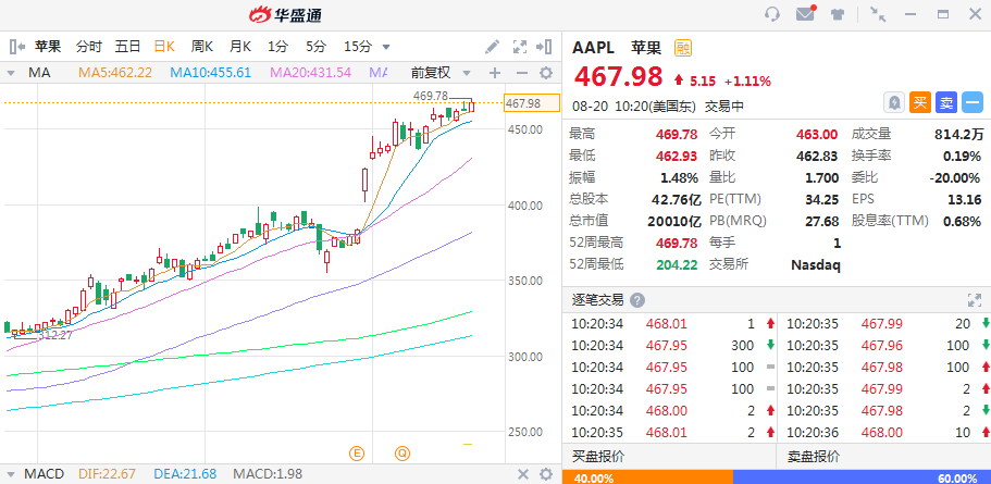 华盛资讯8月20日日消息,继昨日登顶美国首家市值2万亿美元公司后,苹果今日盘中股价一度冲击467美元再创新高,截至北京时间22:20,现涨1.11%,报467.98美元。