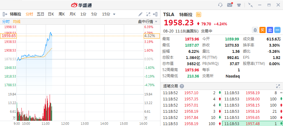 华盛资讯8月20日消息,特斯拉盘中直线拉升,一度逼近1974美元再创历史新高,截至北京时间23:18,现涨4.24%,报1958.23美元。