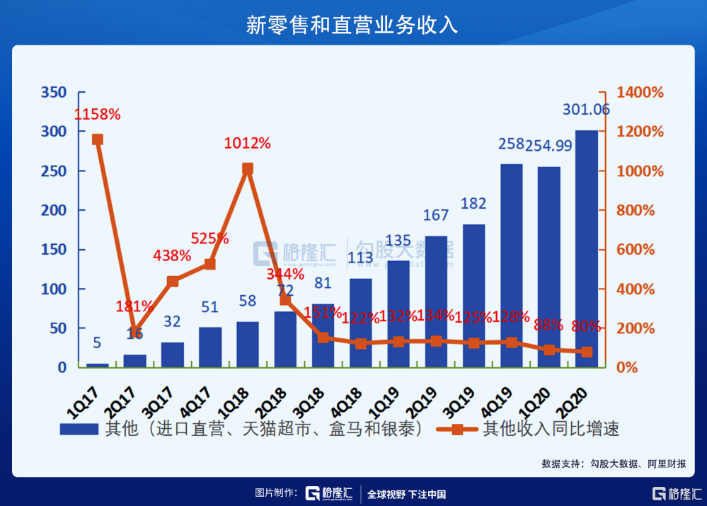 自营业务(1P)方面,本季度阿里实现新零售收入301亿元,同比增长80%,维持在高速的增长,得益于消费者对生鲜等快消品的强劲需求;