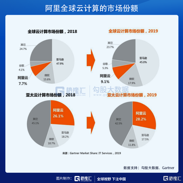 据Gartner2020年4月发布的报告显示,全球市场中,阿里云市场份额从2018年的7.7%上升至2019年的9.1%,位列全球第三。在亚太市场上,阿里云市场份额排名第一,从2018年的26.1%上升至2019年的28.2%,接近亚马逊与微软总和。
