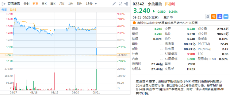 华盛资讯8月21日讯,京信通信(02342)开盘跌9.24%,报3.24港元,市值88.91亿港元。