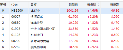 华盛资讯8月21日讯,博彩行业今日整体上涨,其中银河娱乐(00027)现涨5.20%,报61.7港元。澳博控股涨4.82%,金沙中国涨4.52%,永利澳门涨4.23%。