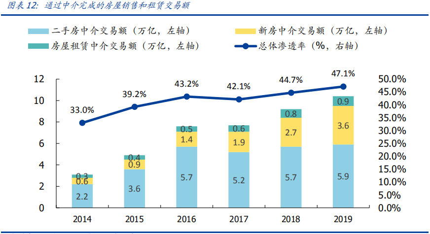 中国通过中介完成的房屋销售和租赁交易额从 2014 年的 3.2 万亿上升到 2019 年的 10.5 万亿,实现 26.8%的年复合增长率,而二手房中介和新房中介市场分别达到 21.6%和 43.1%的年复合增长率,增长速度不容小觑。其中,中介服务在所有房屋交易中的总体渗透率从 2014 年的 33.0%上升到 2019 年的 47.1%,中介服务与房地产交易市场的关系日益紧密。