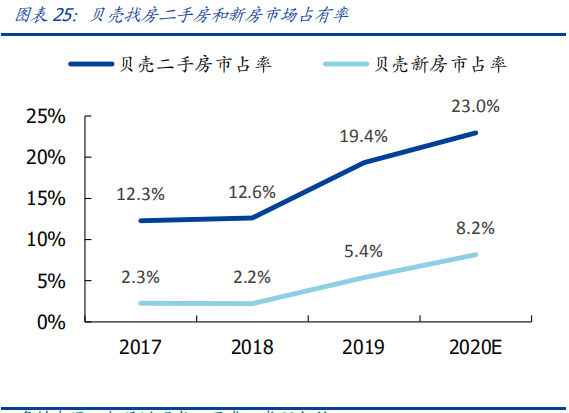 贝壳找房二手房市占率和新房市占率从 2017 年的 12.3%和 2.3%开始逐年提升,2019 年大幅上升,达到 19.4%和5.4%,行业集中度提升拐点已至,作为房地产中介服务行业龙头企业同时也是业内最大平台网络的建立者,贝壳找房未来在二手房和新房市场的市占率预计均会逐年上升,形成如同欧美、日本等发达市场的寡头竞争格局。