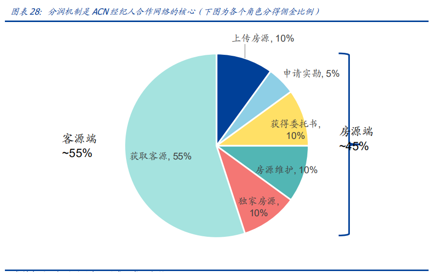 为了解决这个痛点,链家首先创新了 ACN 网络,改变了原有的仅成交经纪人可以获得佣金的模式,实现在一单交易中只要有贡献就能分佣。在这个网络中,有“房源录入人”、“房源维护人”、“委托备件人”、“房源钥匙人”、“房源实勘人”、“客源转介绍”和“客源成交人”等角色,合作网络中的经纪人可以通过任一个环节的贡献最终获得收益,链家内部各个门店的经纪人首先有了跨门店合作的动力。