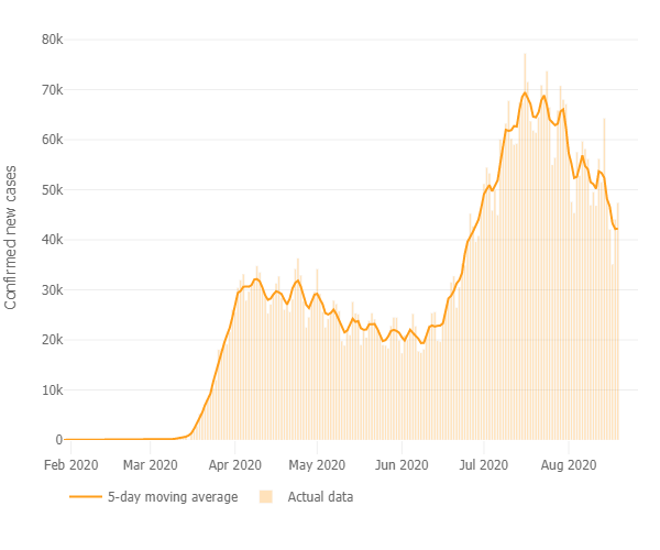 根据约翰·霍普金斯大学的数据,截至周三,过去一周的平均滚动新增确诊人数降到了47300人,远低于7月22日的峰值67317人。
