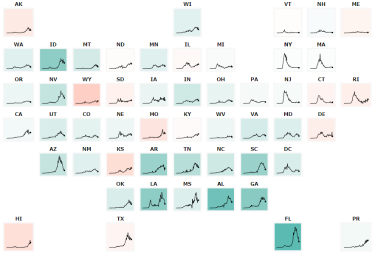 但值得庆幸的是,佐治亚州、德州、佛州、亚利桑那州和加州的新增确诊数正在逐步下降。