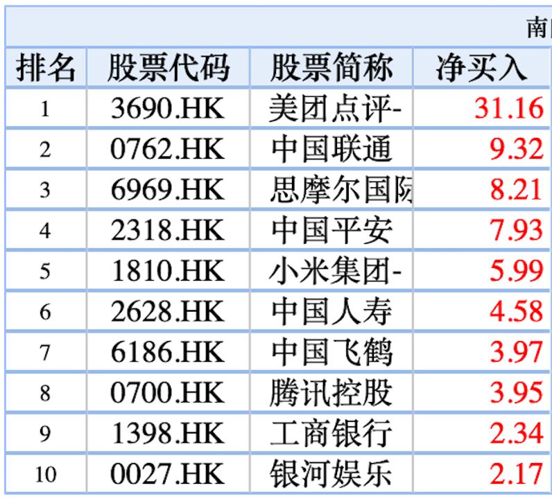 南下资金重点加仓美团点评、中国联通、思摩尔国际、中国平安;减持中芯国际、药明生物、瑞声科技、舜宇光学科技、中国建材;