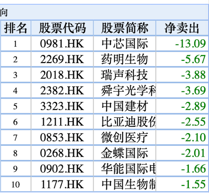 本周,南下资金大幅减持了中芯国际,净卖出13.09亿港元。此外,南下资金还减持了药明生物、瑞声科技、舜宇光学科技、中国建材等标的。