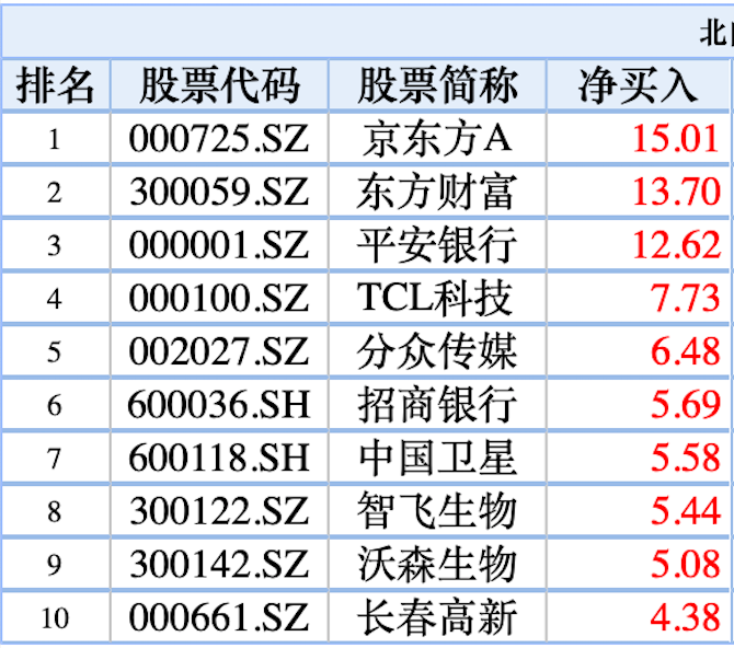 北上资金大幅加仓京东方A、东方财富、平安银行、TCL科技、分众传媒;