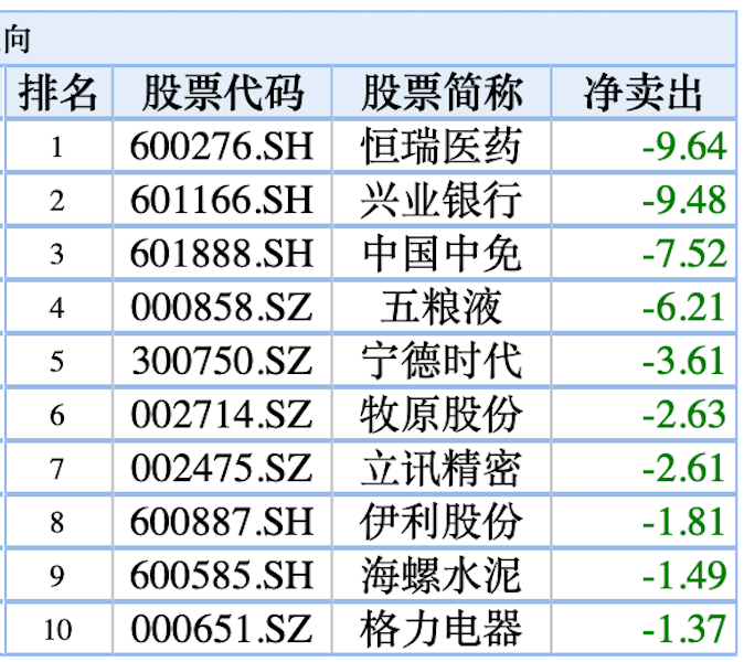 本周北上资金净卖出较多的个股包括恒瑞医药、兴业银行、中国中免、五粮液、宁德时代。其中,恒瑞医药遭净卖出9.64亿元,兴业银行遭净卖出9.48亿元。