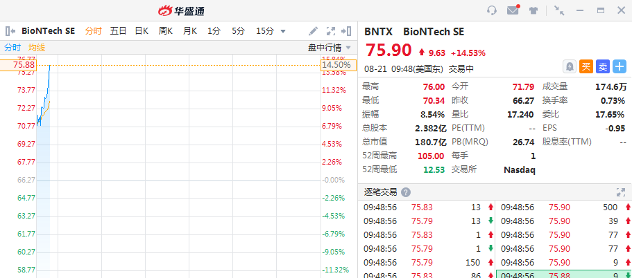 华盛资讯8月21日消息,BioNTech SE股价迅速拉升,截至北京时间21:48,涨14.53%,报75.9美元。