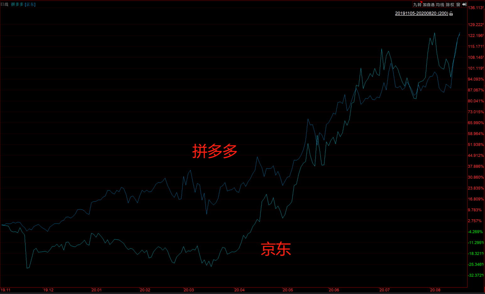 (今年以来拼多多和京东在美股的走势对比)