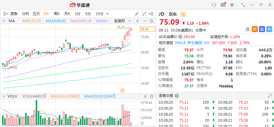 华盛资讯8月21日消息,京东股价连续第5日上涨,盘中再创记录新高,截至北京时间22:38,现涨1.56%,本周累计上涨超过21%。
