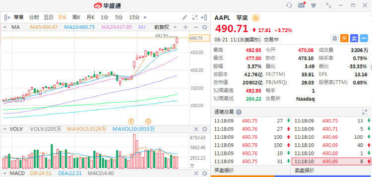 华盛资讯8月21日消息,苹果股价周五大涨3.72%,创逾一周最大涨幅,也是自8月12日以来的最大涨幅,远远跑赢其他大型科技股。