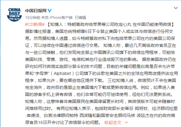 原标题:知情人:特朗普政府给苹果等公司吃定心丸 在中国仍能使用微信 来源:中国日报网