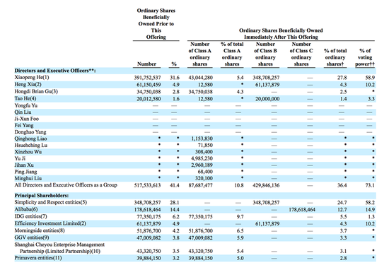 IPO后,小鹏汽车联合创始人、董事长兼CEO何小鹏将持有27.8%的股份并享有58.9%的投票权,联合创始人兼总裁夏衍、副董事长兼总裁顾宏地以及联合创始人兼高级副总裁何涛则将分别持有4.3%、2.5%和1.4%的股份。