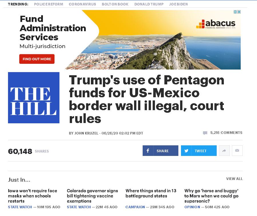 不过美墨边境墙竣工200英里的庆祝仪式刚刚过去3天,特朗普大赞边境墙阻挡新冠病毒,加固边境安全的讨论热度还维持高位的时候,在6月26日,美国加州一家联邦法院就裁定,特朗普政府挪用五角大楼资金修建美国与墨西哥间的边境墙属于违法行为。