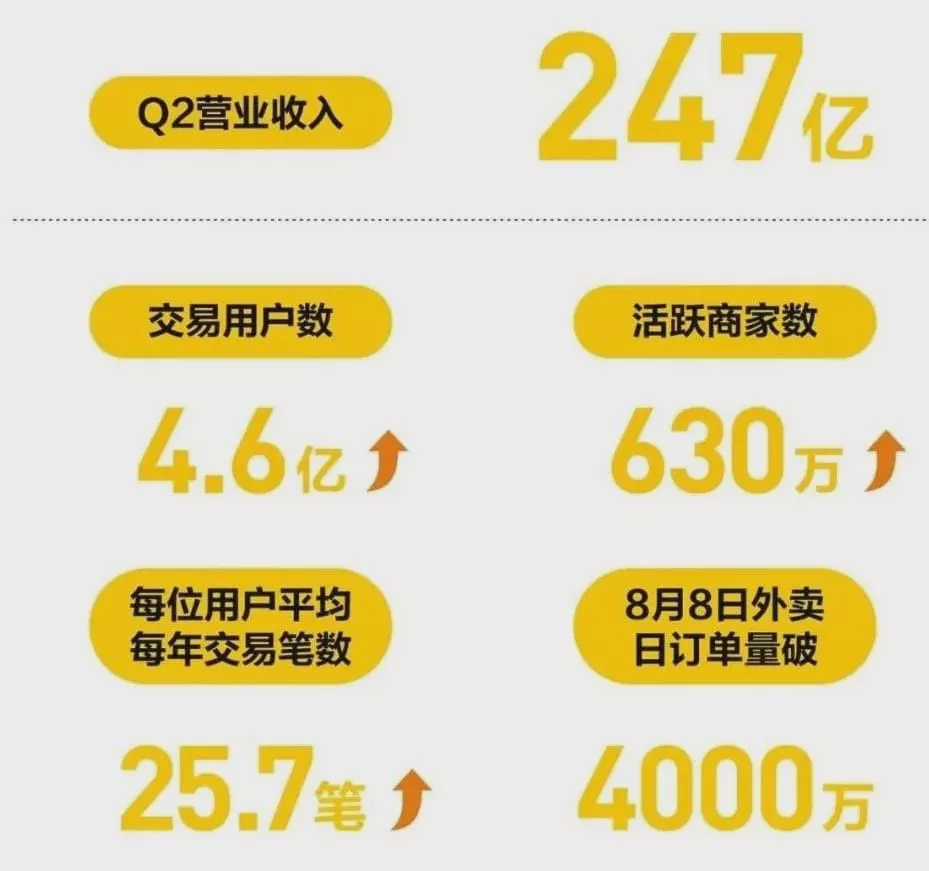 平台上逐渐恢复的商户自然吸引了更多的用户聚集,不仅客单价有所提高,日订单量也在稳步提升。根据美团的Q2财报显示,交易用户数达到了4.6亿人,与Q1相比,同比增加8.2%,本季度餐饮外卖的交易金额同比增长16.9%至1088亿元,日均订单量升至2450万笔,8月8日,美团外卖宣布单日订单量突破了4000万。