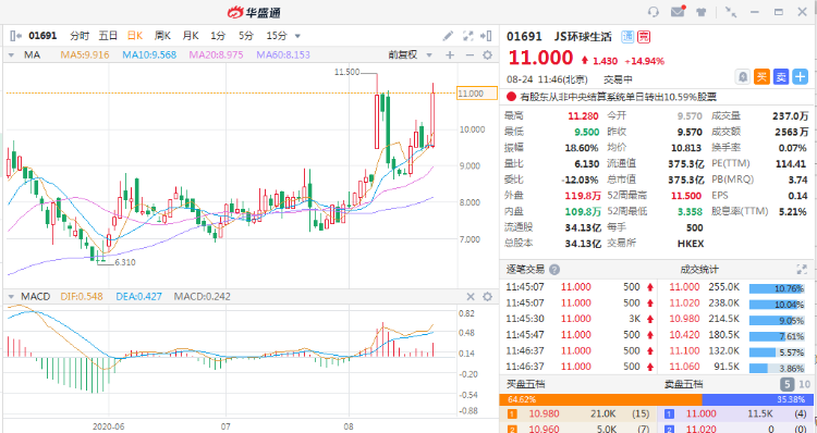 本月上旬预计明天(25日)放榜的中绩起码多赚近3.6倍至1亿美元的JS环球生活(01691.HK) ,今早股价再度逼近盈喜日(10日)所创上市高位11.5港元,最高见11.28港元,现造11港元,急涨15%,成交额增至2563万元。