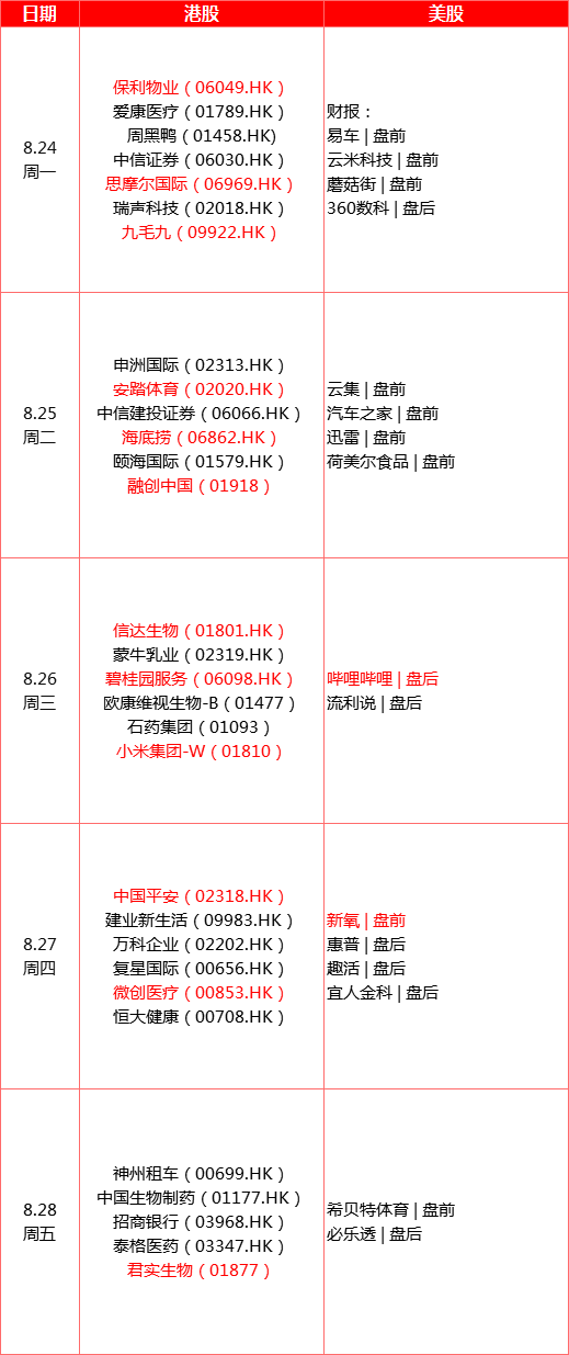 本周港美股市场将迎来多家公司的重磅财报密集发布。其中港股市场关注度最高的有7月新晋上市的“电子烟第一股”思摩尔国际;著名的连锁餐饮公司九毛九、海底捞;地产物业板块的巨头公司融创中国、碧桂园服务、保利物业;