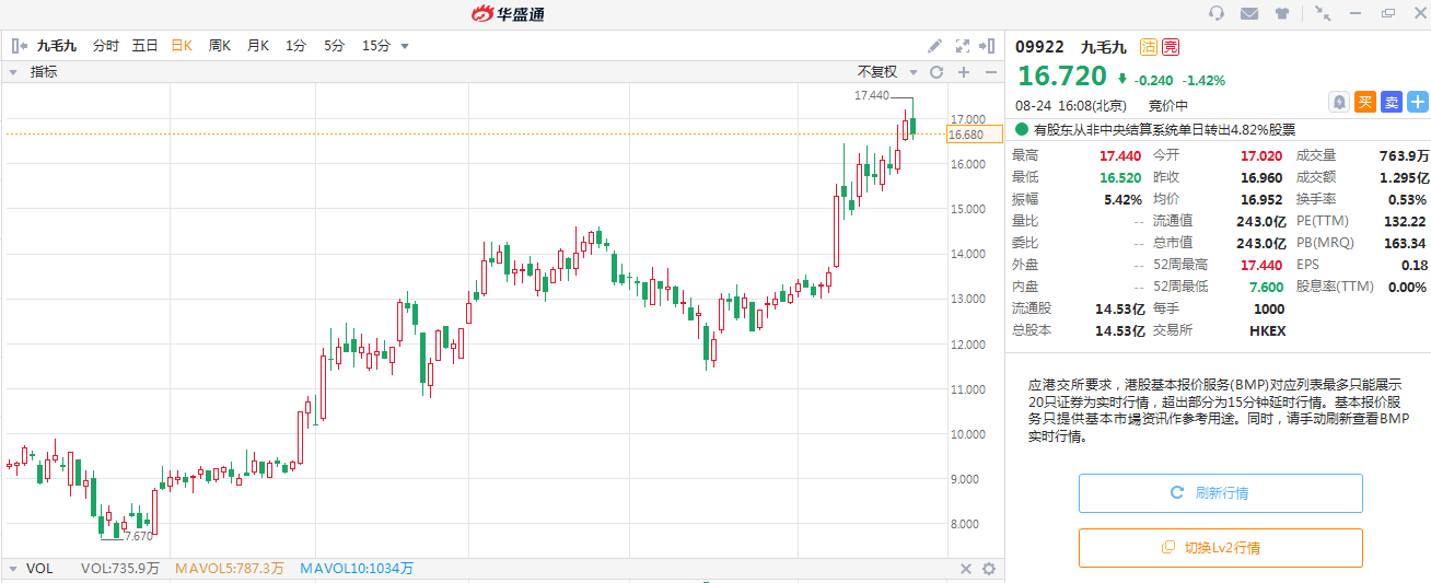 九毛九的股价也已经早早启动了,8月中旬以来其股价就持续上扬,最新股价17港元水平较招股价6.6港元已经上涨超150%。
