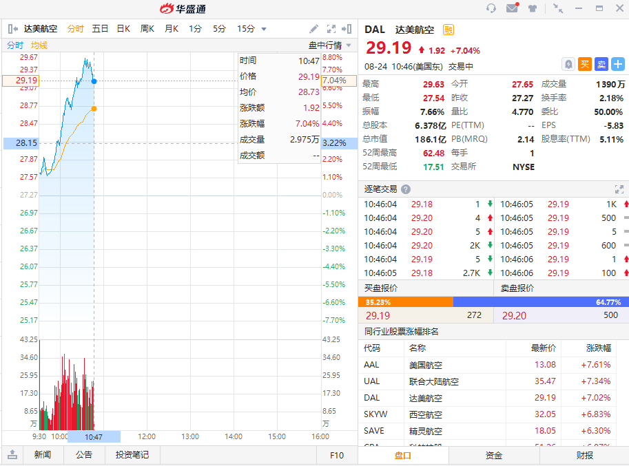 华盛资讯8月24日消息,截至北京时间22:46,美国航空(AAL.US)涨8.47%,西南航空(LUV.US)涨5.25%,达美航空(DAL.US)涨7.04%。