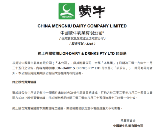 8月25日消息,蒙牛乳业在港公告,一项条件未能于先决条件届满日期达成,终止收购Lion-Dairy and Drinks的交易。鉴于该公告中所述的其中一项条件未能于先决条件届满日期达成,订约方于二零二零年八月二十四日以书面方式终止股份买卖协议,幷于澳洲悉尼时间二零二零年八月二十五日凌晨十二时零一分生效。终止股份买卖协议对本集团现时之营运、业务或财务状况并不会造成重大不利影响。