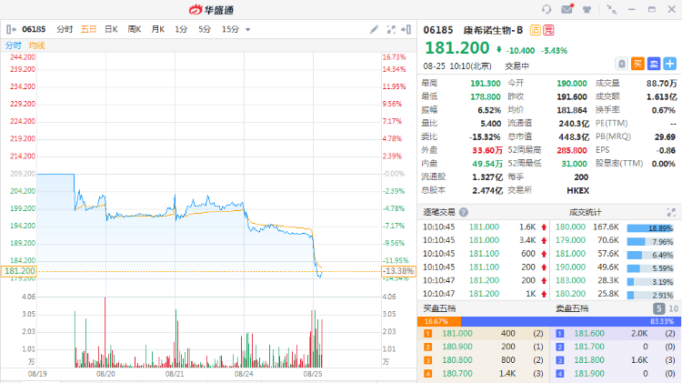 华盛资讯8月25日讯,康希诺生物(06185.HK)现跌5.43%,报181.2港元,总市值448.3亿港元