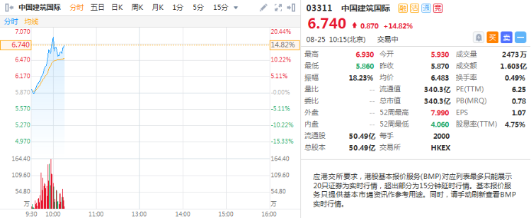 华盛资讯8月25日讯,中国建筑国际(03311.HK)现涨14.82%,报6.74港元,总市值340.3亿港元。