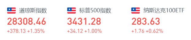 美股周一收高,道指涨逾370点。标普500指数史上首次收在3400点上方,与纳指均创收盘新高。其中,道指涨378.13点,涨幅1.35%,报28308.46点;纳指涨67.92点,涨幅0.60%,报11379.72点;标普500指数涨34.12点,涨幅1.00%,报3431.28点。