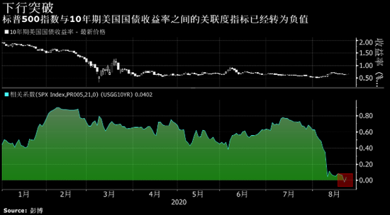 据瑞信集团称,投资者再也不能依靠债券来减轻股市投资风险了,因为两种资产间的传统关系如今已被打破。标普500指数与10年期美国国债收益率之间的21天关联度指标7月中旬还维持在0.80左右的水平,而到8月21日却已经变成了负值。“这种关联度的破裂,加上处于纪录低点的利率波动率,表明债券已不再是分散股票投资风险的有效工具,”瑞信衍生品策略师Mandy Xu在8月24日的一份报告中说。“我们建议投资者着眼专门针对股市风险的对冲工具,在股票波动率日趋正常化的形势下尤该如此。”