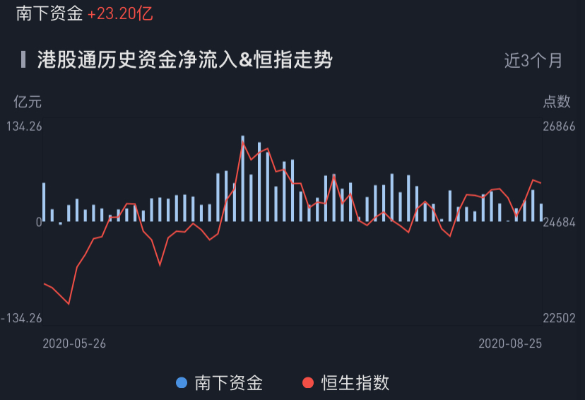 华盛资讯8月25日讯,南下资金今日净流入港股23.20亿港元,较前数个交易日略有下滑。
