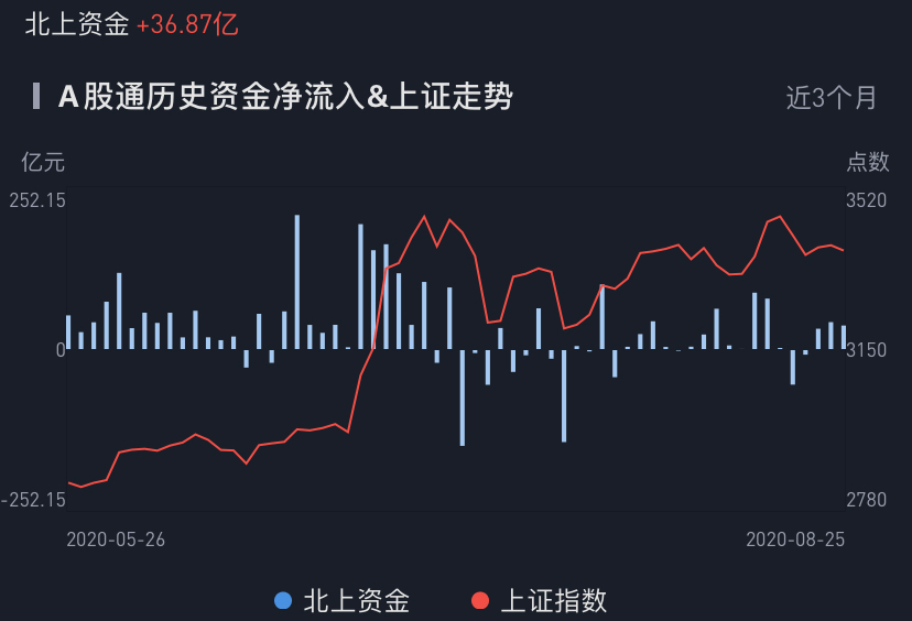 北上资金今日净流入A股36.87亿元,与上一交易日基本持平。