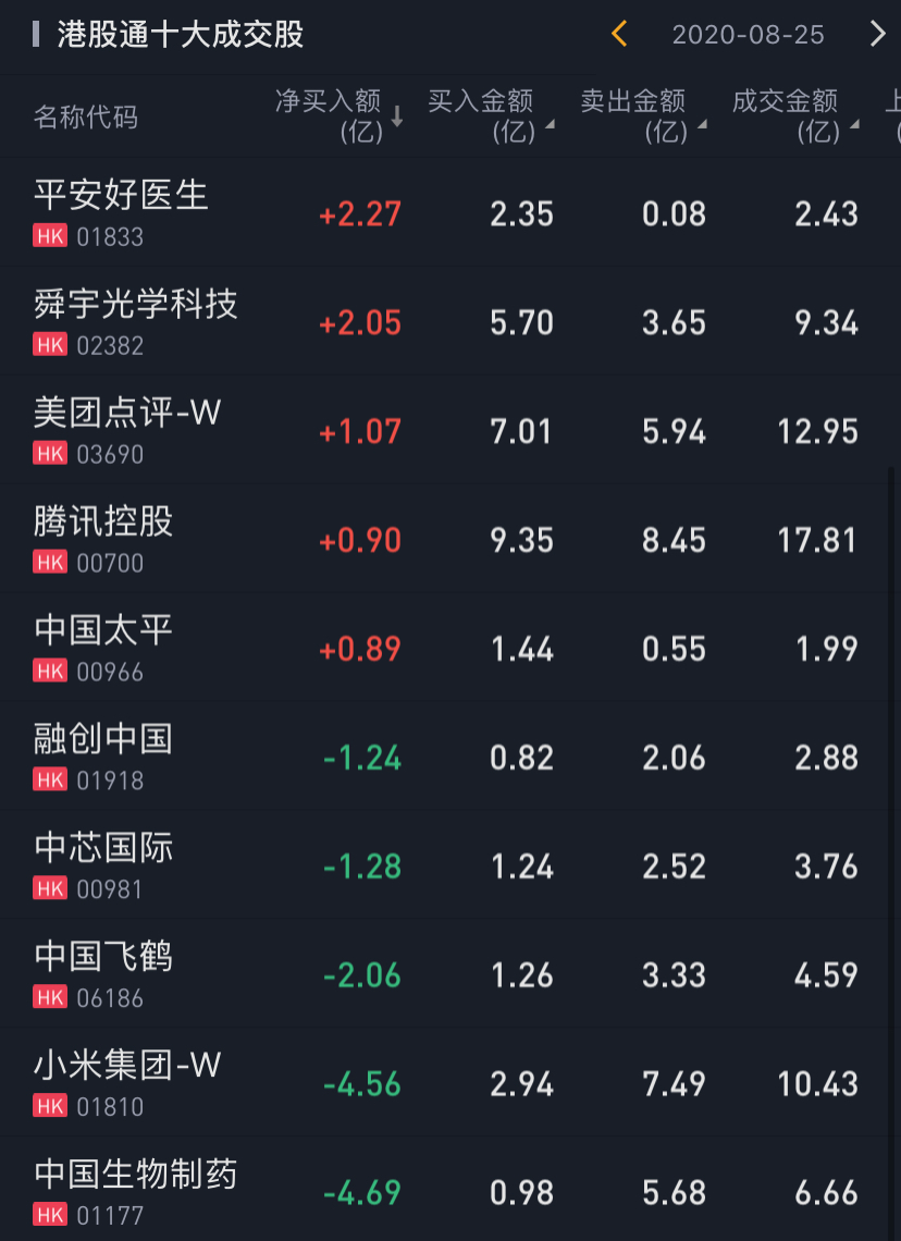 个股方面,今日南下资金净买入平安好医生2.27亿港元,净买入舜宇光学科技2.05亿港元。
