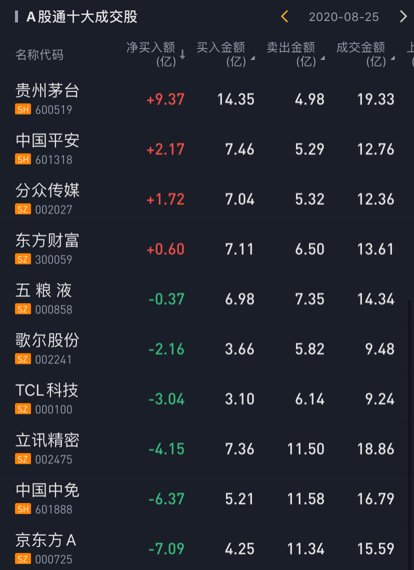 北上资金今日净买入贵州茅台9.37亿元,净买入中国平安2.17亿元,净买入分众传媒1.72亿元。