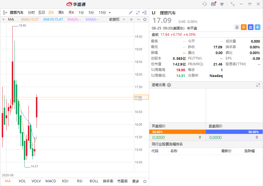 华盛资讯8月25日消息,理想汽车今日盘前股价持续走高,现涨4.39%,报17.84美元。