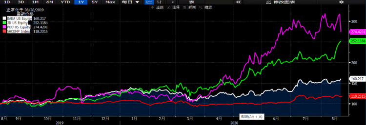 就最近一年来说,阿里、京东、拼多多的股价表现均远胜于上证综指,特别是拼多多,截至8月24日的最近一年时间里,其股价已上涨174%,而同一时间段,上证综指的涨幅仅为18%。