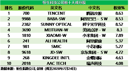 目前,阿里巴巴、腾讯等科技巨头,以及中芯国际、微盟集团等细分领域的龙头企业均包含在内。信息科技类公司权重合计为68.3%,比重最大的成分股是腾讯,占比达8.63%。其次是阿里巴巴、舜宇光学、美团点评和小米集团分别占比8.53%、8.52%、8.3%和7.89%。