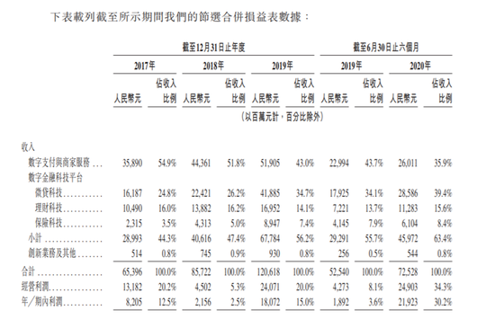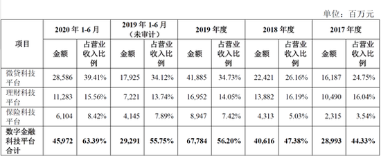 其中,2020年上半年收入超过285亿元,占比39.41%,去年同期营收为179亿元,占总收入比重为34.12%。2017年至2019年,微贷业务营收分别为约418亿元、224亿元和161亿元,占比均超过20%。