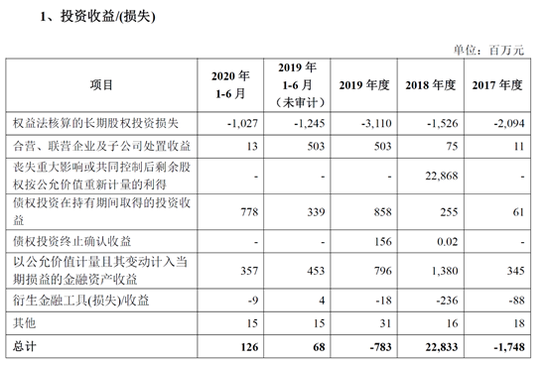 数据显示,2017年度、2018年度、2019年度和2020年1-6月,该公司投资(损失)/收益分别为-17.48亿元、228.33亿元、-7.83 亿元和1.26 亿元,占营业收入的比例分别为-2.67%、26.64%、-0.65%和0.17%。